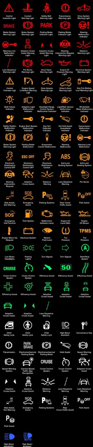 Many warning lights, particularly green symbols are used to inform the driver that a system or utility has been switched on. The system is working correctly or is currently in use. This indicates the brakes are being. As many deem it to be dangerous. Each warning symbol is displayed along with a description of its meaning and what action you.
