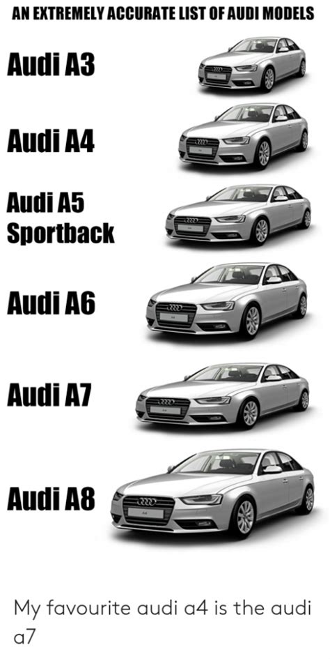 Audi Model List . Discover all available audi models here. The audi a4 is a lineup of luxury cars designed and manufactured by audi, a german automaker.